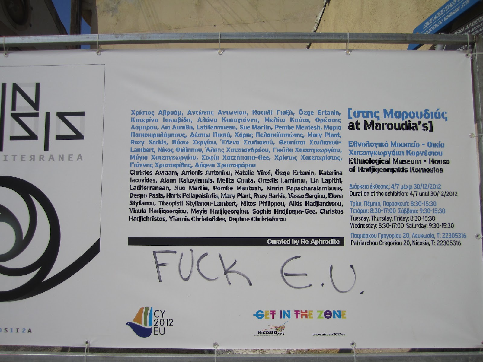 a sign that says “fuck E.U.” written on a billboard promoting the EU.
