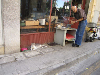 an old man with lots of cats in his shops (I love cats and I love old people)
